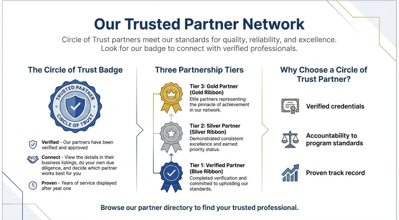 The Circle of Trust is a national network that verifies professional credentials — licenses, bonds, and business registrations — to help consumers find professionals who meet established standards. We do not endorse individual services or guarantee results.